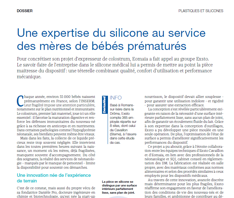 Le savoir-faire de l'entreprise dans le silicone médical lui a permis de mettre au point la pièce maitresse du dispositif : une téterelle combinant qualité, confort d'utilisation et performance mécanique.